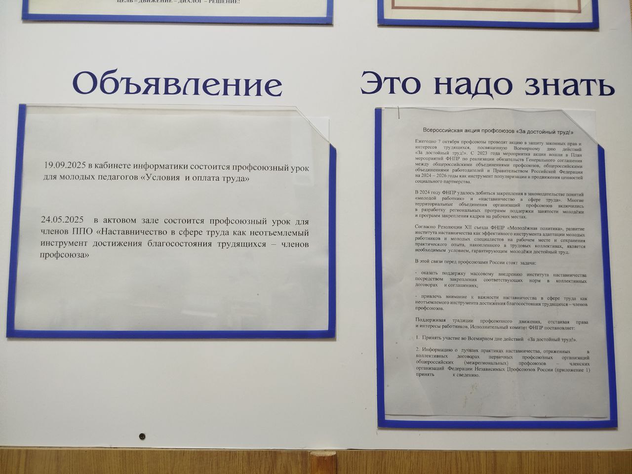 - 19.09.2025 проведен профсоюзный урок для молодых педагогов «Условия и оплата труда»;
