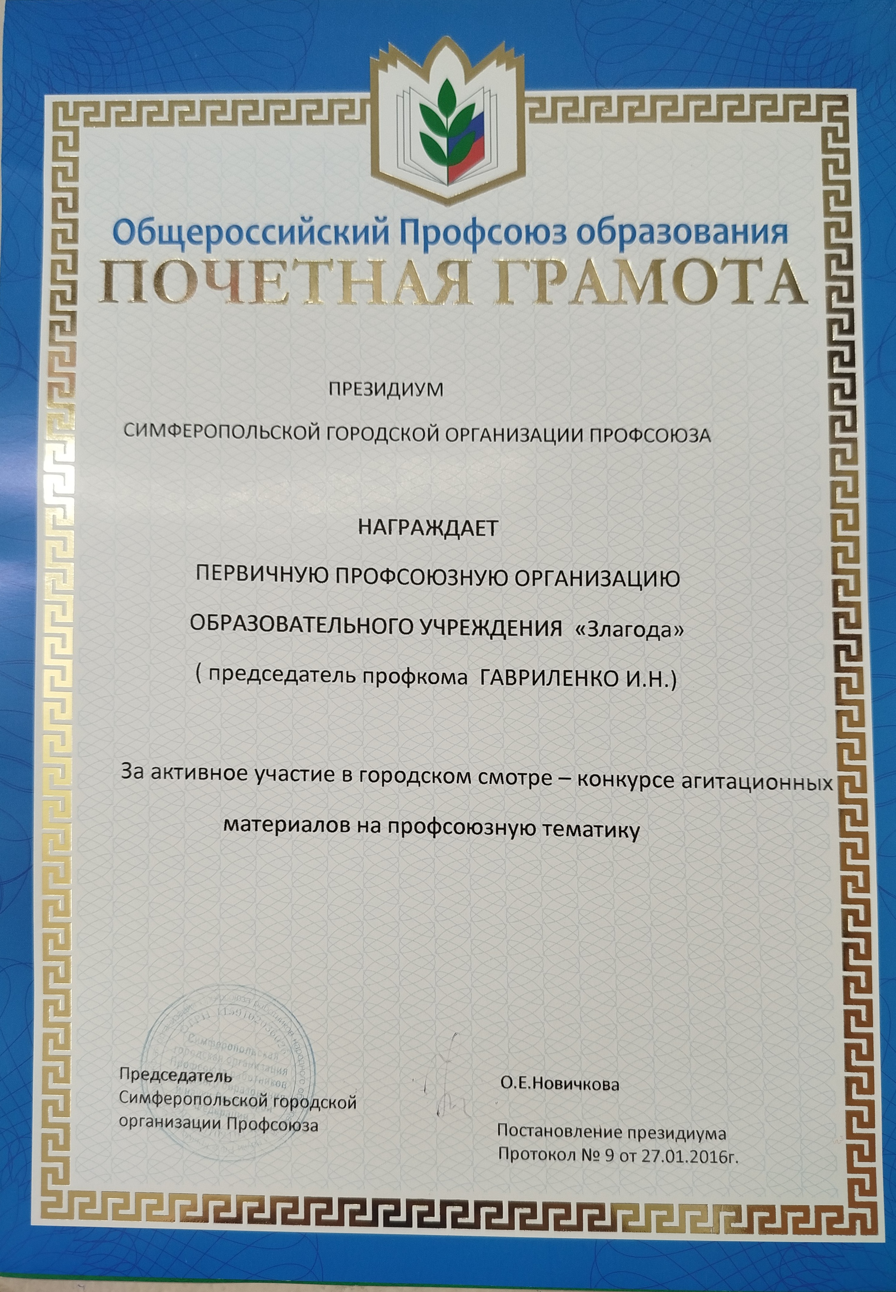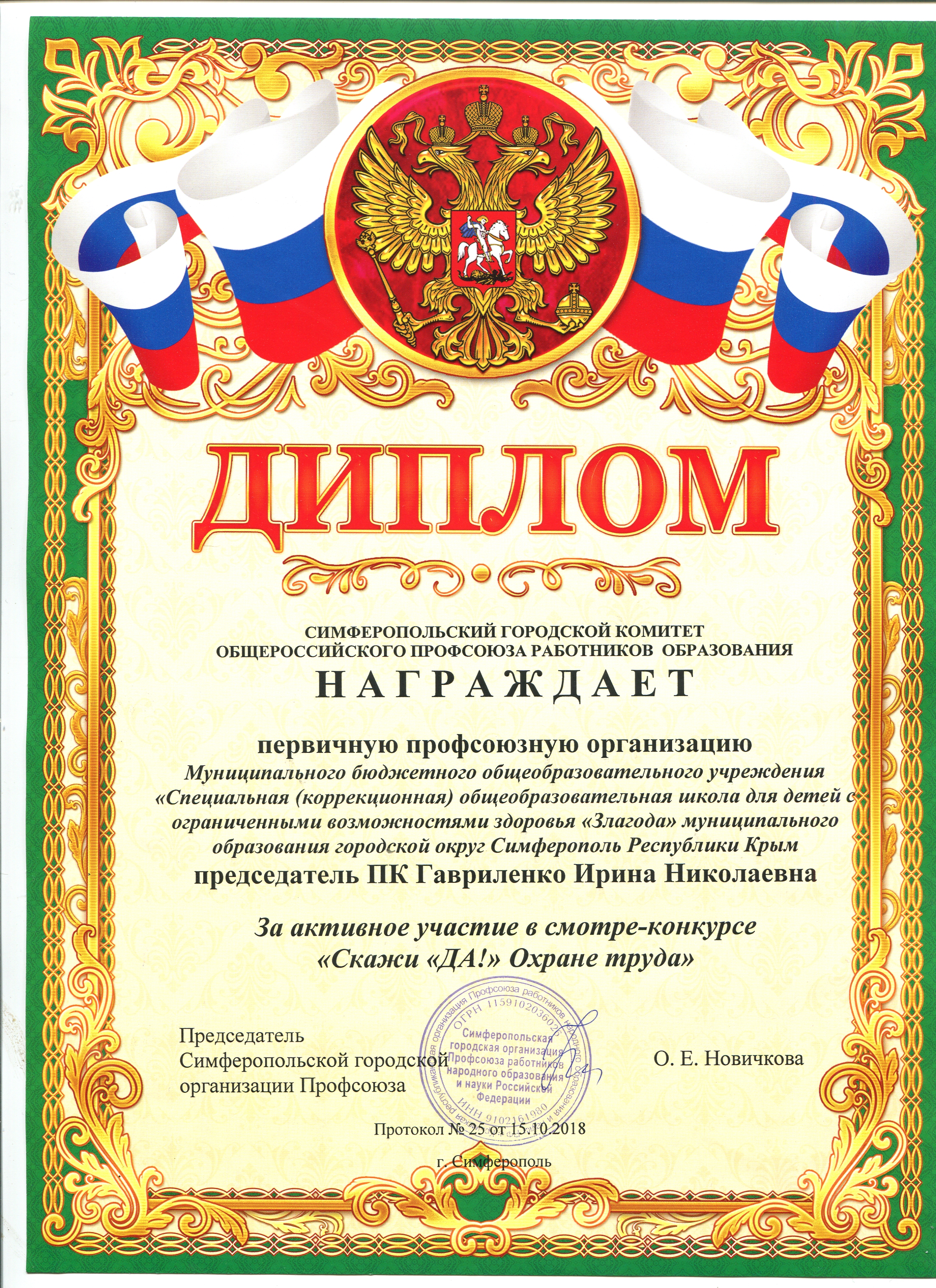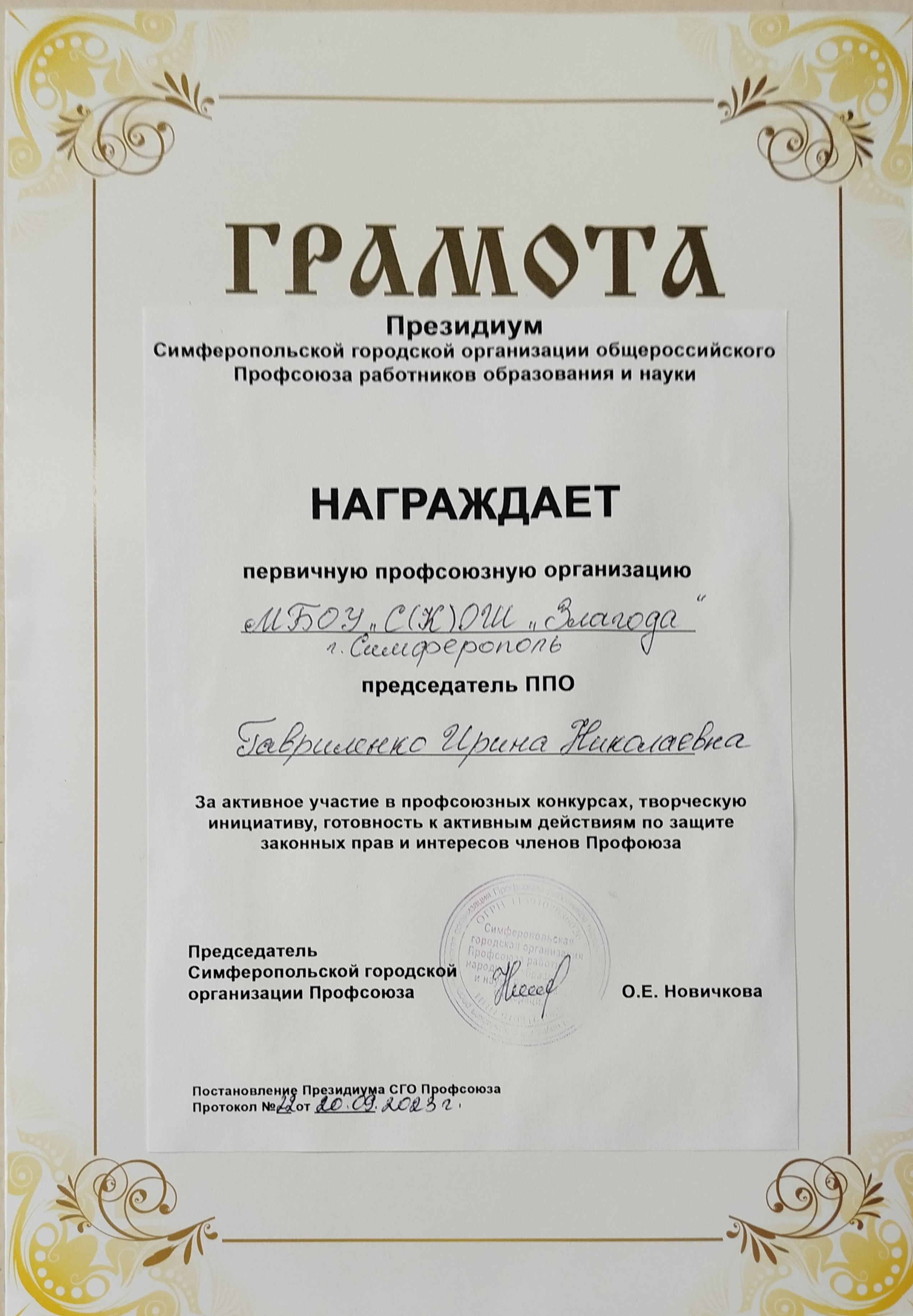 Симферопольский городской комитет СГООПО отметил активную работу членов профкома нашей организации Величко А. А. и Гончарук Н. В.